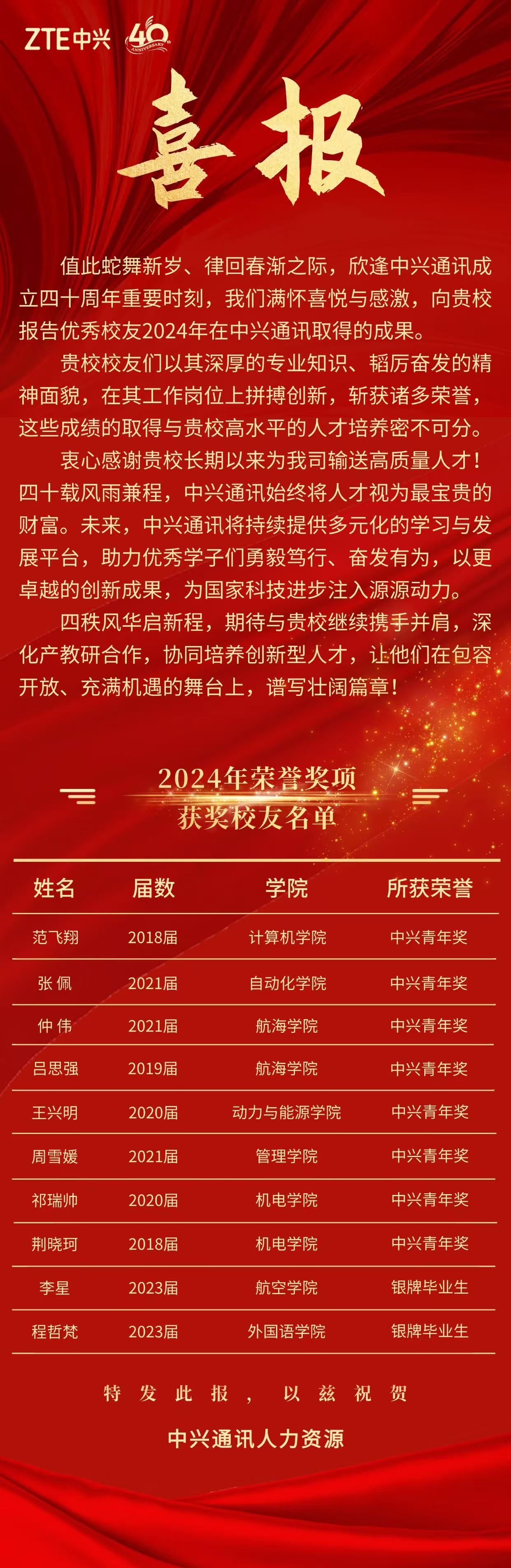 近日,中兴通讯向我校发来喜报,我院2018届硕士毕业生荆晓珂、2020届硕士毕业生祁瑞帅荣获“中兴青年奖”。此奖项是中兴通讯为毕业生颁发的最高荣誉之一,是公司对做出杰出贡献员工的认可与激励。获奖者经层层选拔、激烈角逐后,从数千名毕业生中脱颖而出,是公司未来发展的中流砥柱。荆晓珂,2015-2018年就读于机械设计及理论专业,现于中兴通讯从事无线基站的嵌入式软件开发工作。祁...
